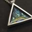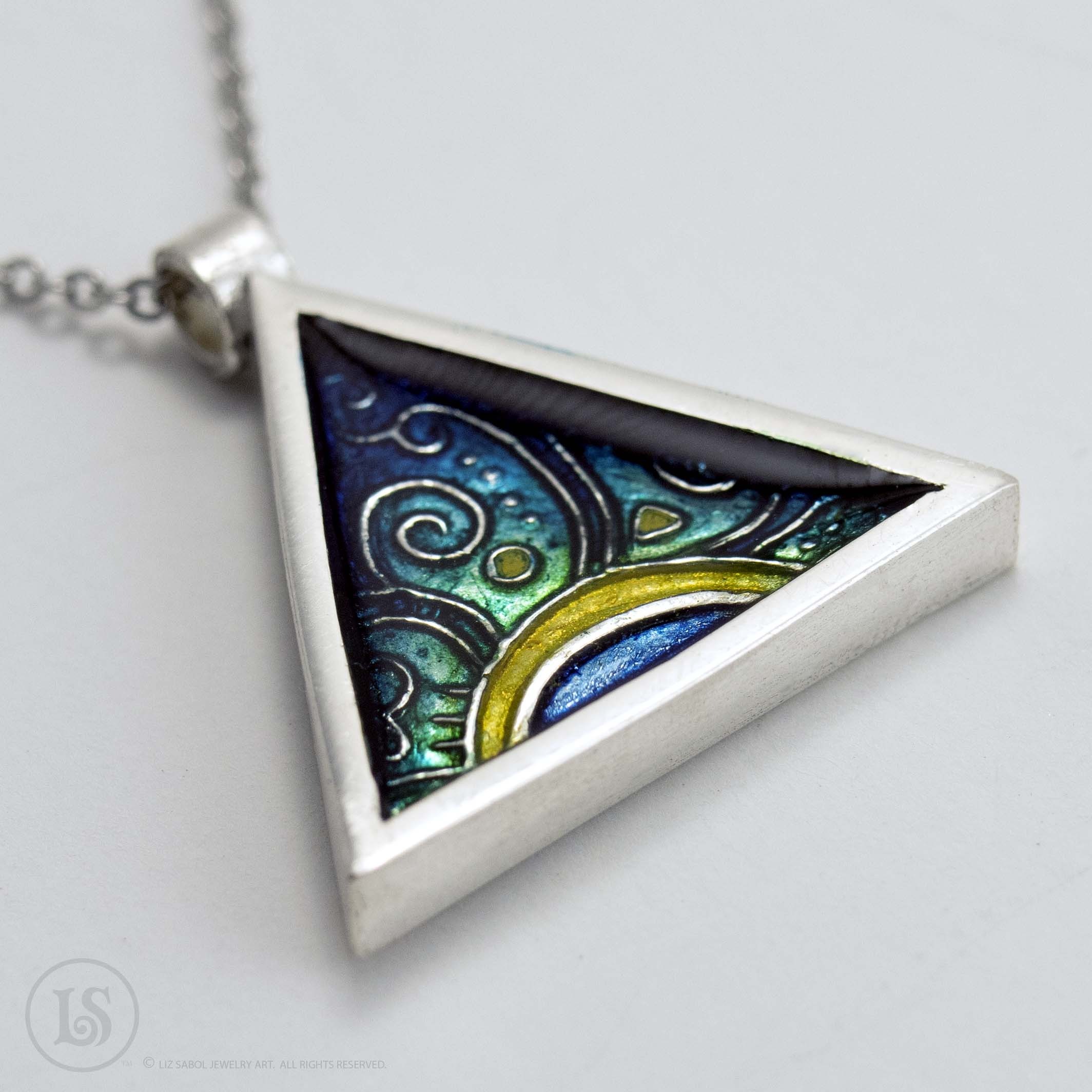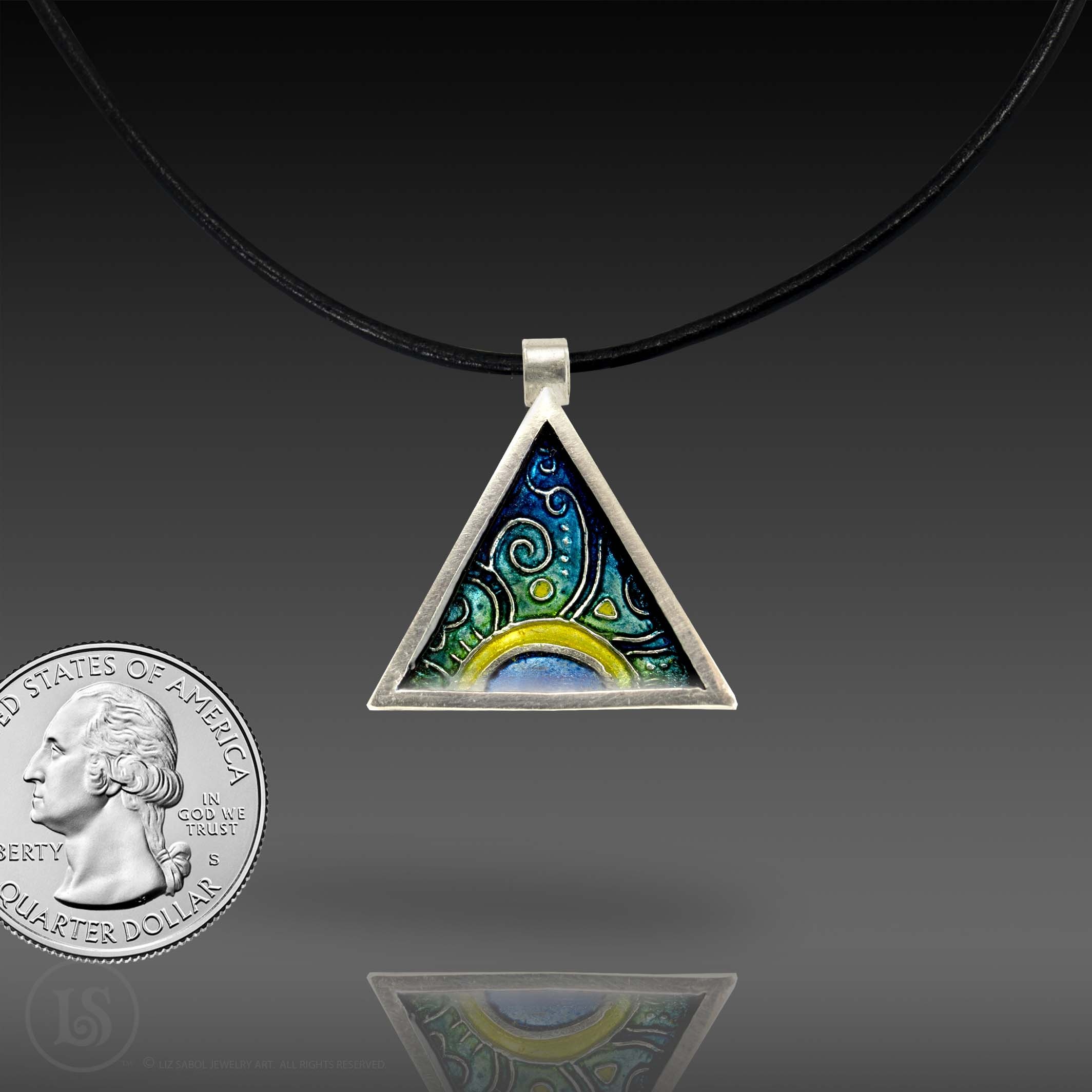 Hand-painted 960 sterling silver. Hand-made, one-of-a-kind. Cold-enamel. Ink, resin. Bail fits delicate cords and chains. Cord/chain not included.