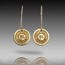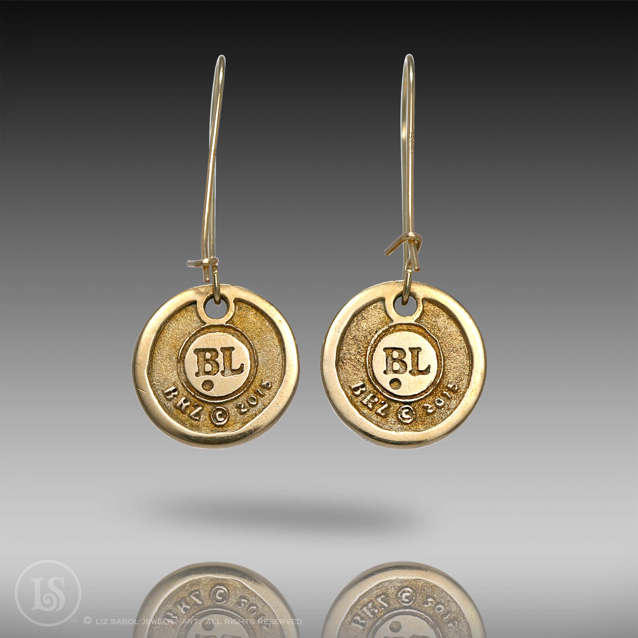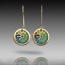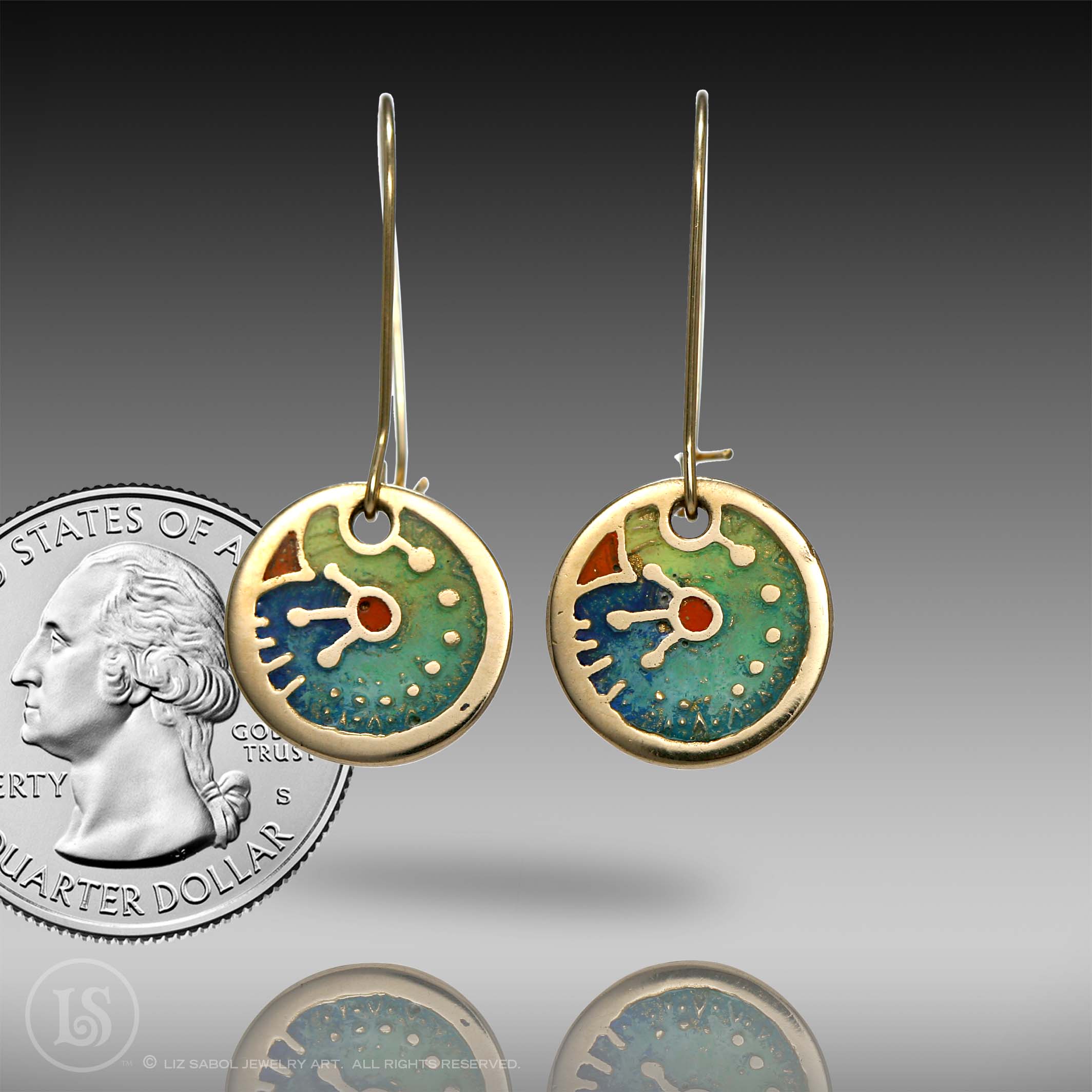 These earrings are hand-crafted in bronze metal clay, hand-painted and filled with resin.  The resin is sanded flush and re-polished.  The kidney earwires are 14K gold filled, and the wire thickness is 21 gauge.  There is a hook in the back, providing a secure closure to prevent loss. Lightweight at 2.5 grams each, makes for comfortable wearing.