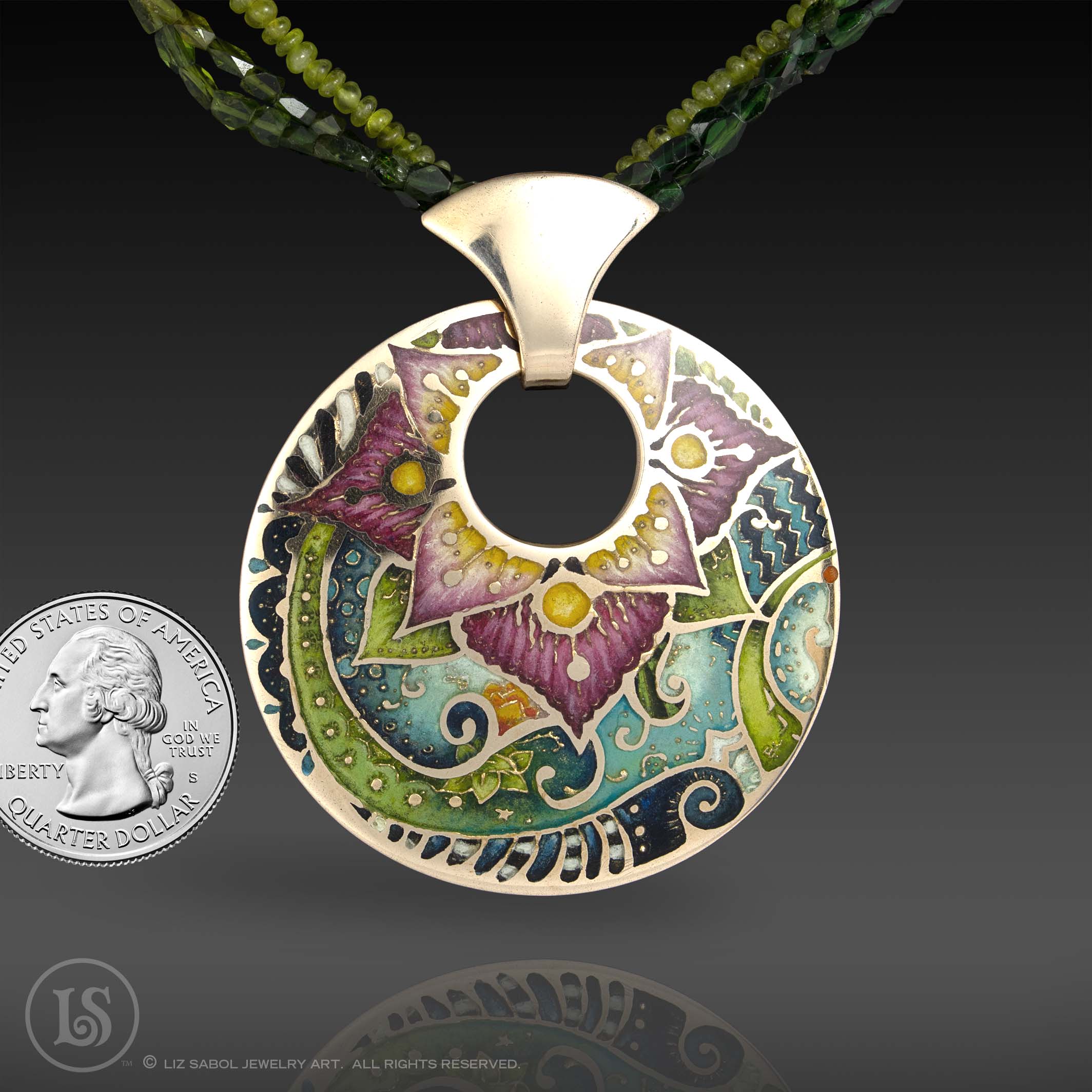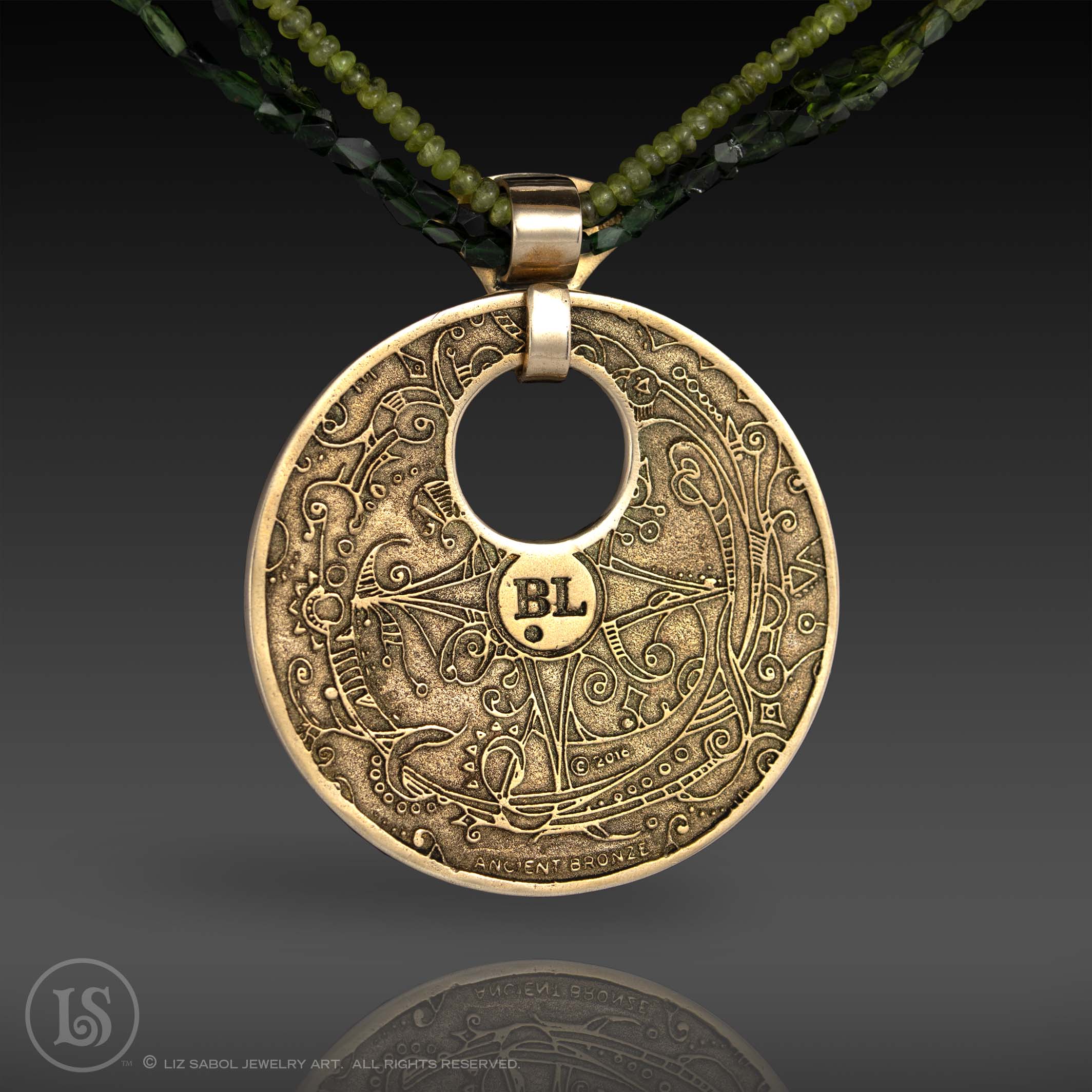 This pendant is hand-crafted in bronze metal clay, hand-painted and filled with resin.  The resin is sanded flush and re-polished.