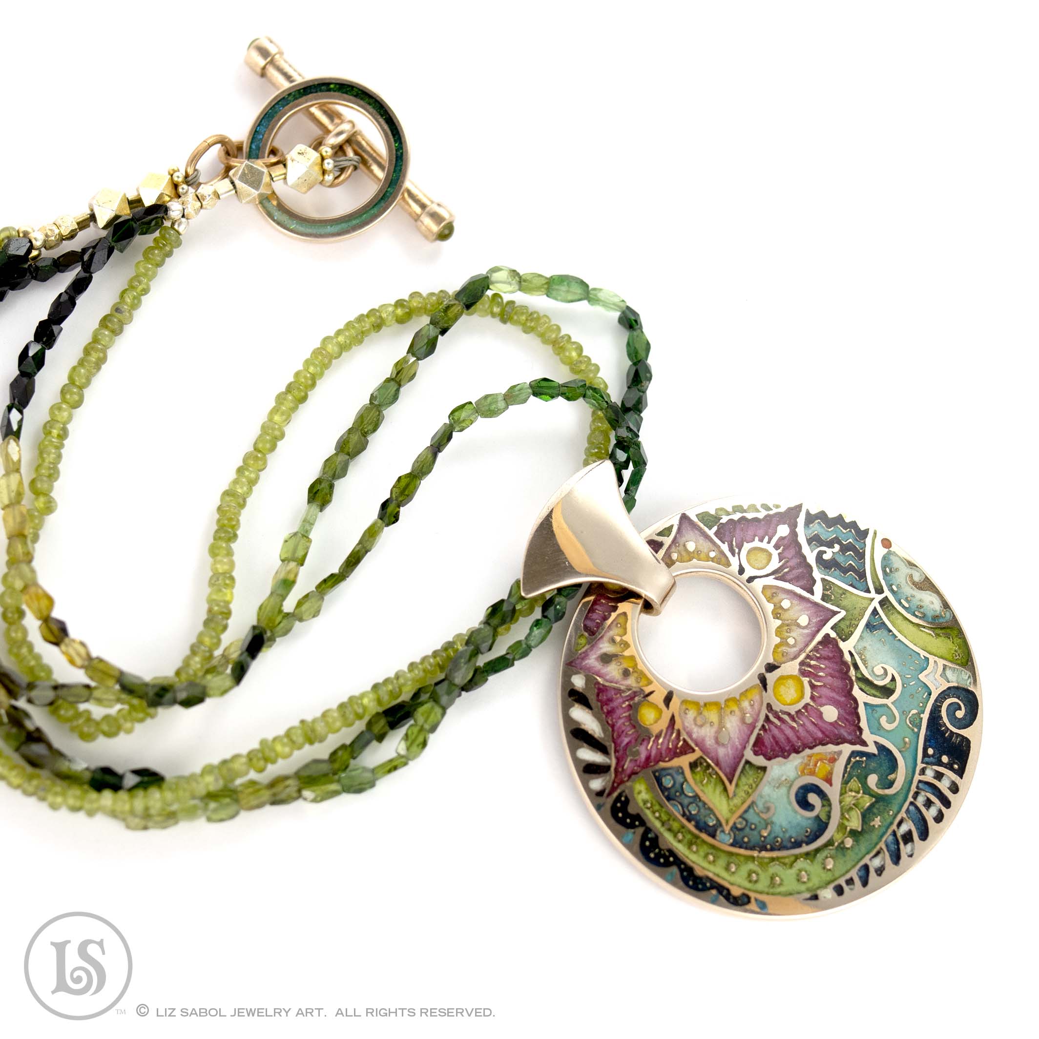 It is on a 16" necklace of Tourmaline and Vesuvinite. The bar and loop clasp is also made in the same process. Periodot cabochons accent the ends of the bar.