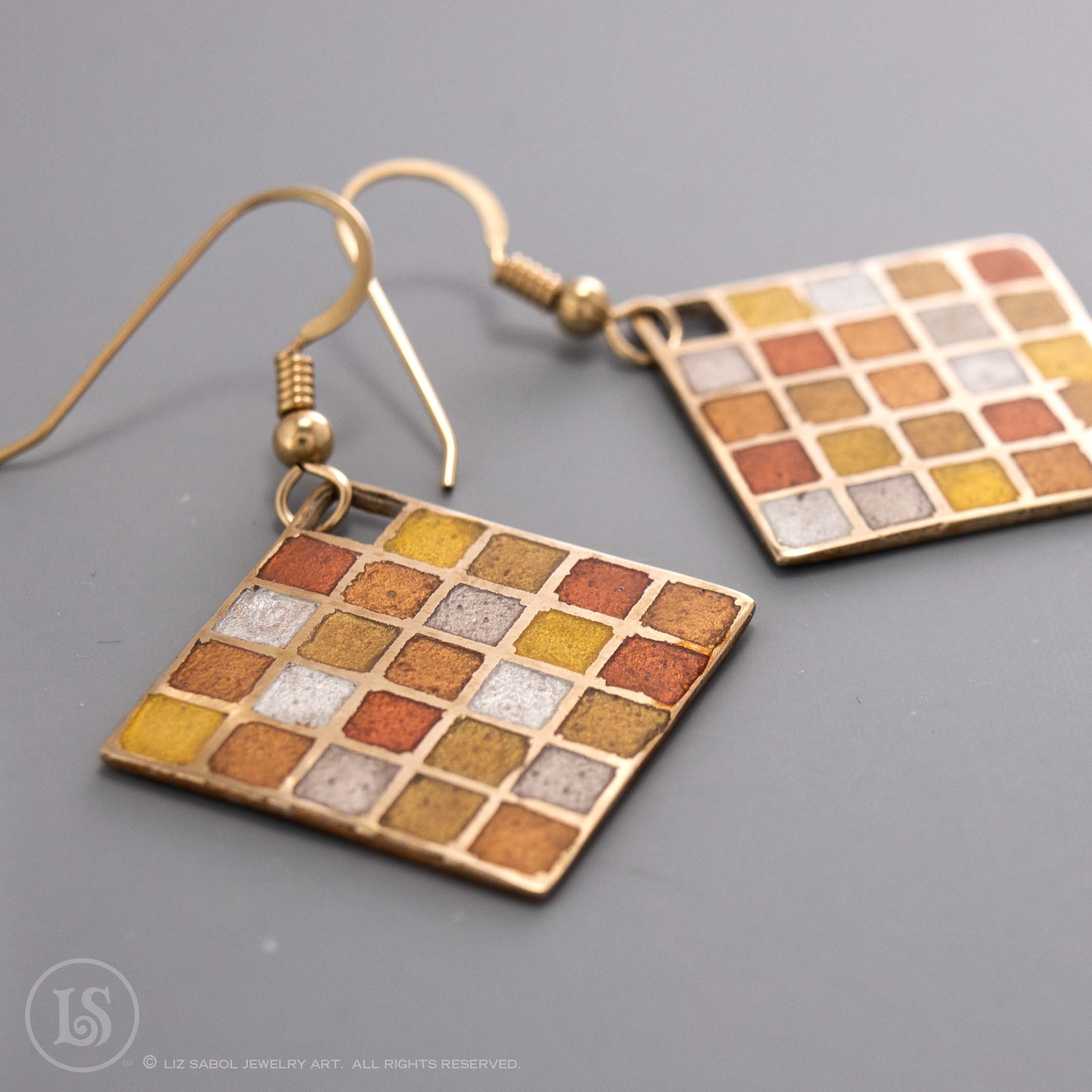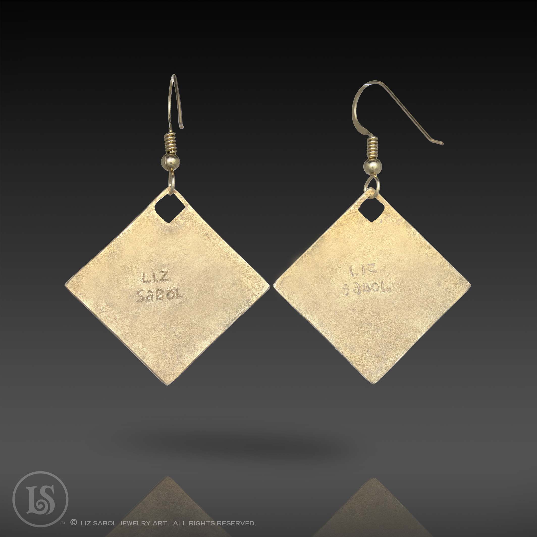 These earrings are hand-crafted in bronze metal clay, hand-painted and filled with resin. The resin is sanded flush and re-polished.