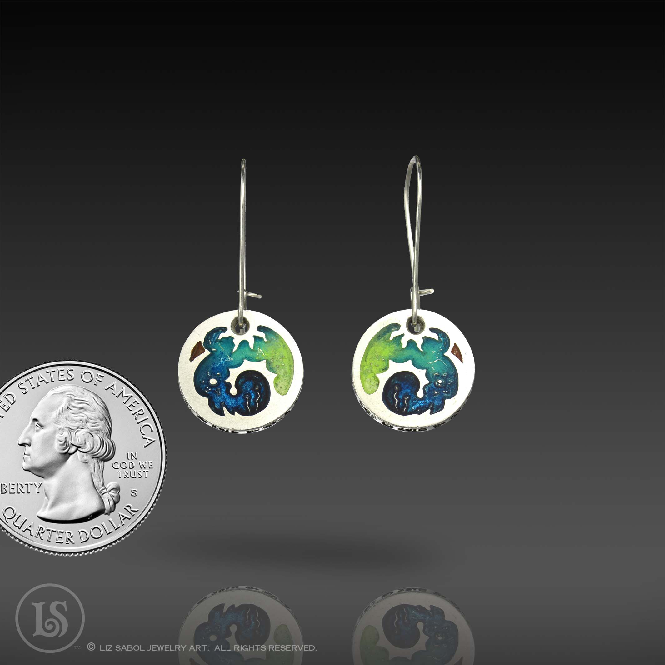 These earrings are hand-crafted in 960 sterling silver metal clay, hand-painted and filled with resin. The resin is sanded flush and re-polished.