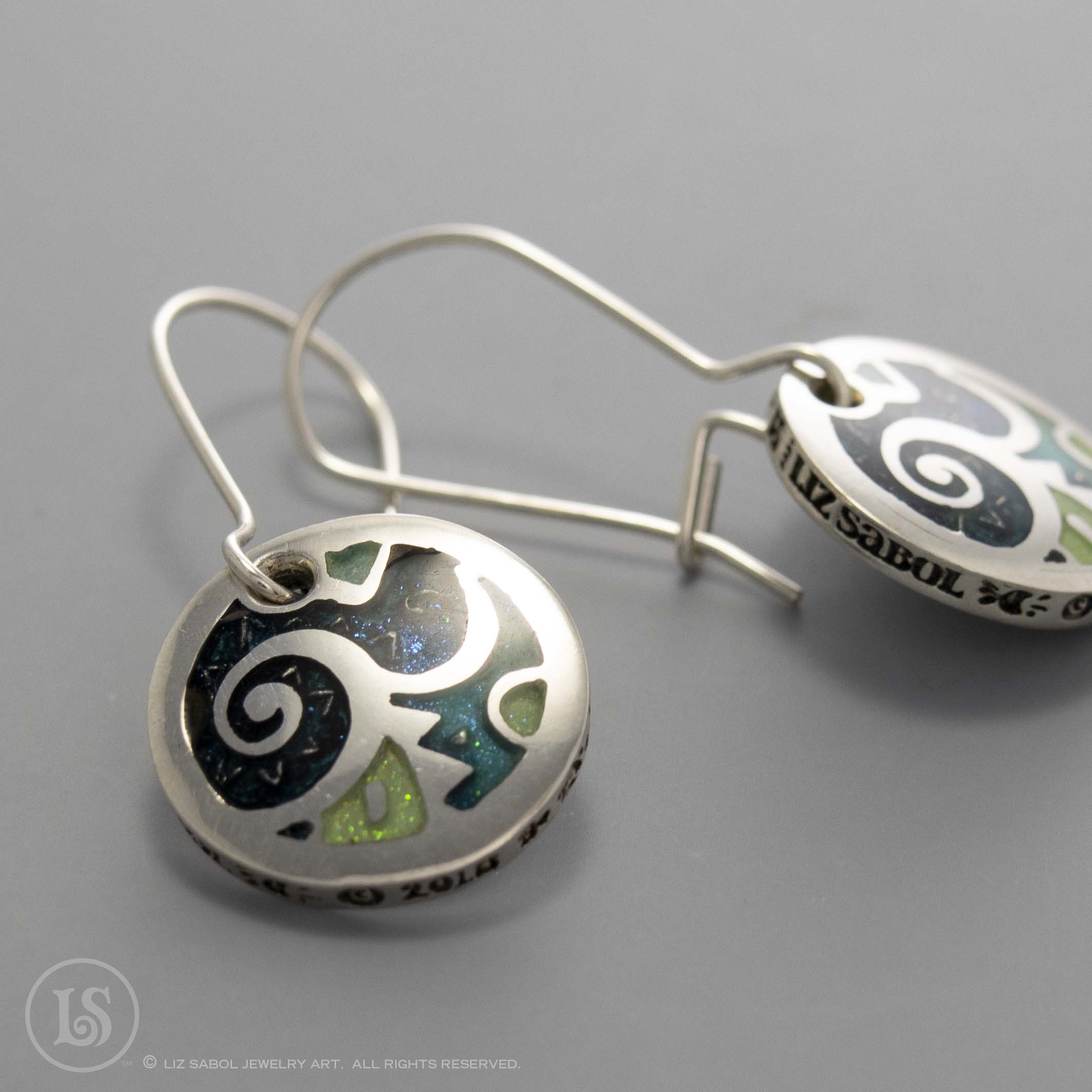 These earrings are hand-crafted in 960 sterling silver metal clay, hand-painted and filled with resin. The resin is sanded flush and re-polished.