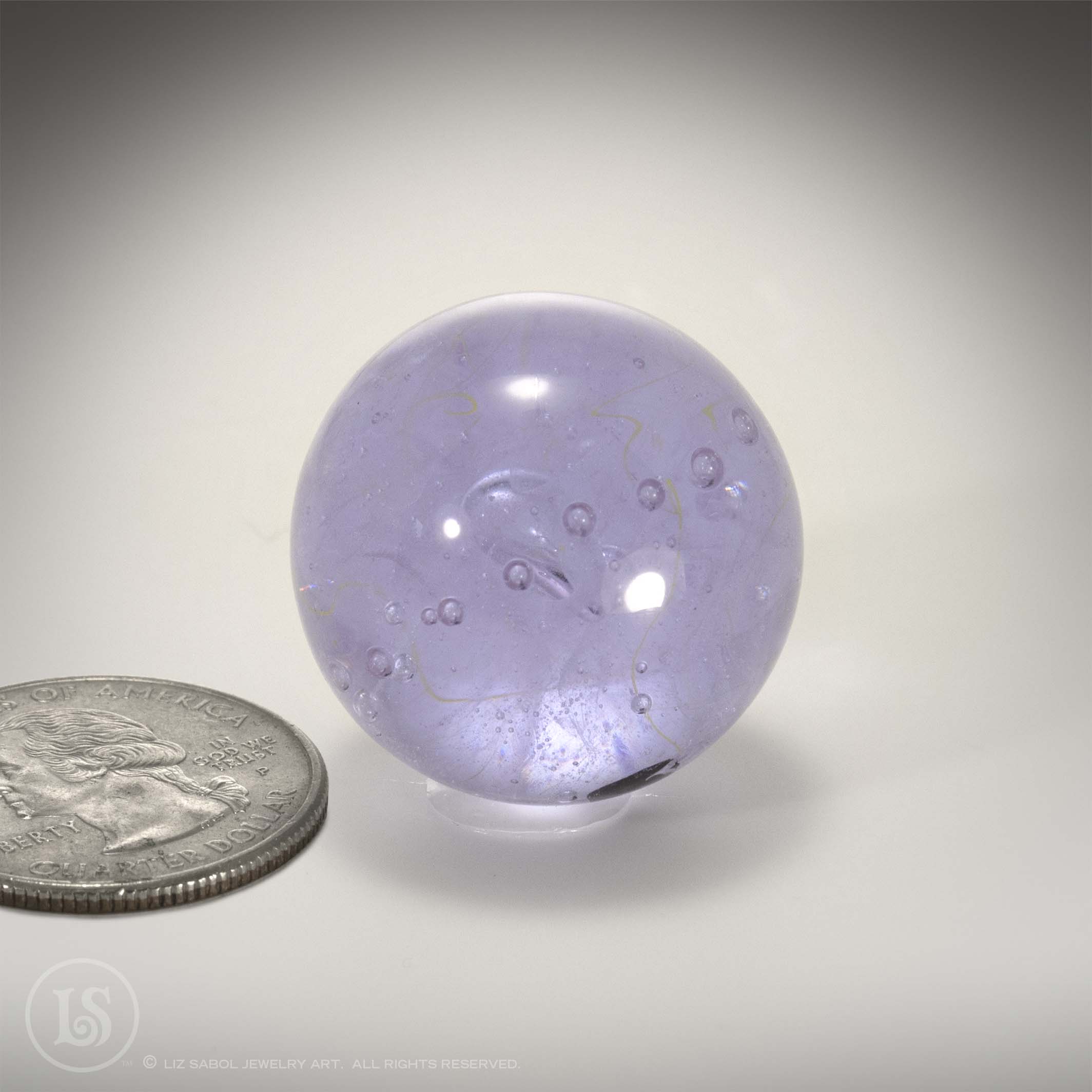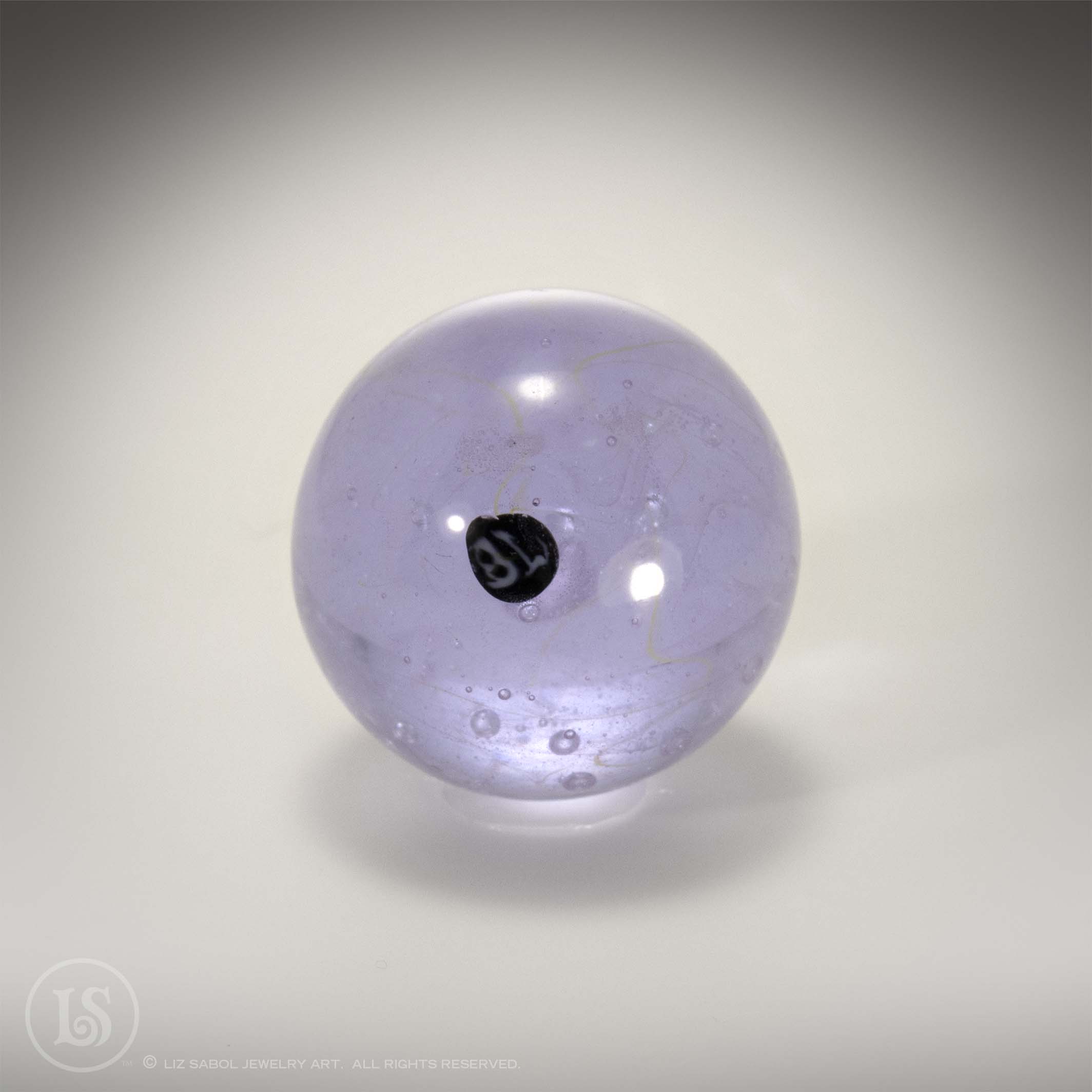 Hand-made one-of-a-kind lampworked glass marble. Signed BL (Bead Lizzy, my previous brand name) on the bottom with hand-made cane. This marble color-shifts. It is purple in natural light, and pink under incandesent. A simple plastic stand is included. Hand-made bronze stands are available for purchase.