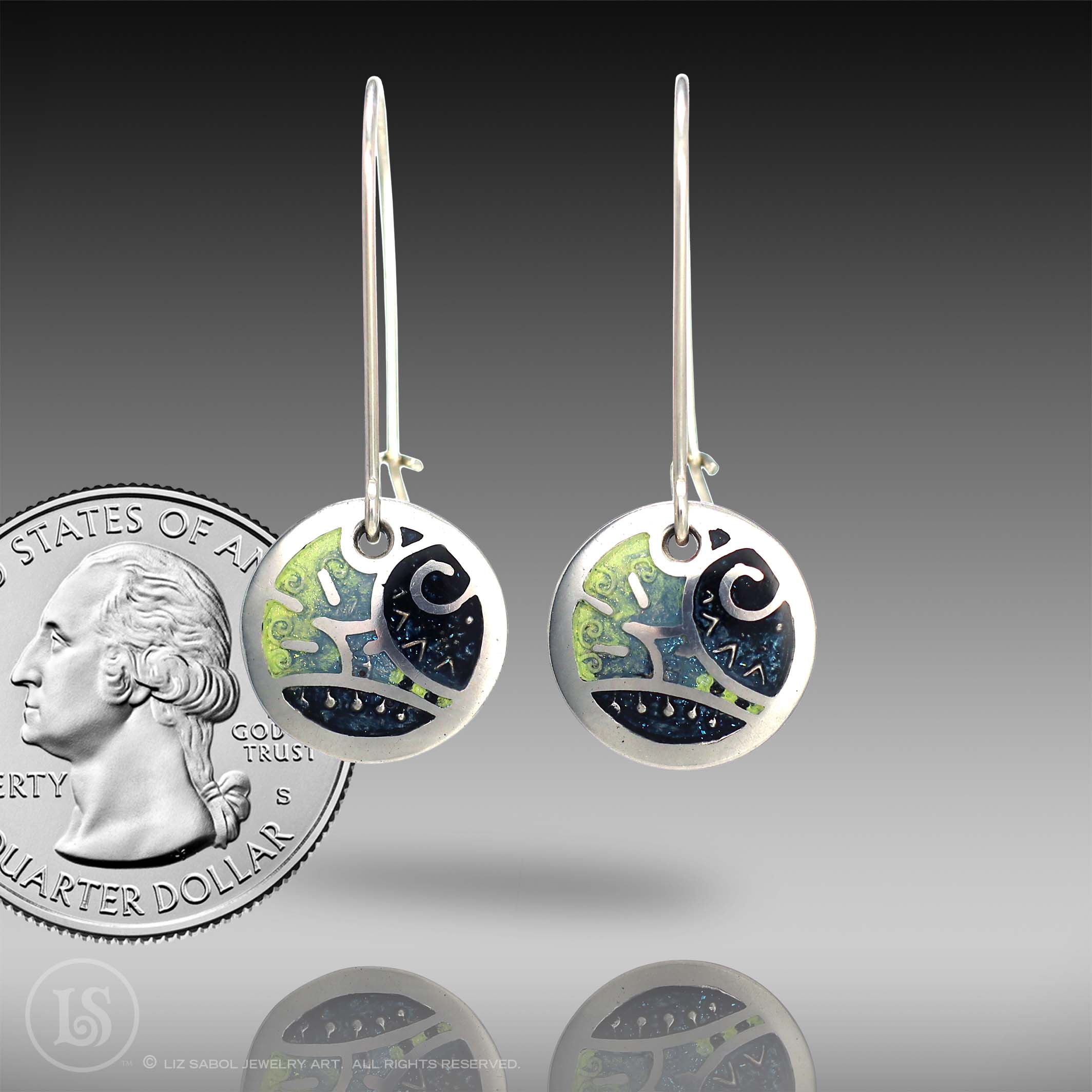 These earrings are hand-crafted in 950 sterling metal clay, hand-painted and filled with resin.  The resin is sanded flush and re-polished.  The kidney earwires are 925 sterling, and the wire thickness is 20 gauge.  There is a hook in the back, providing a secure closure to prevent loss. Lightweight at 2.5 grams each, makes for comfortable wearing.