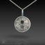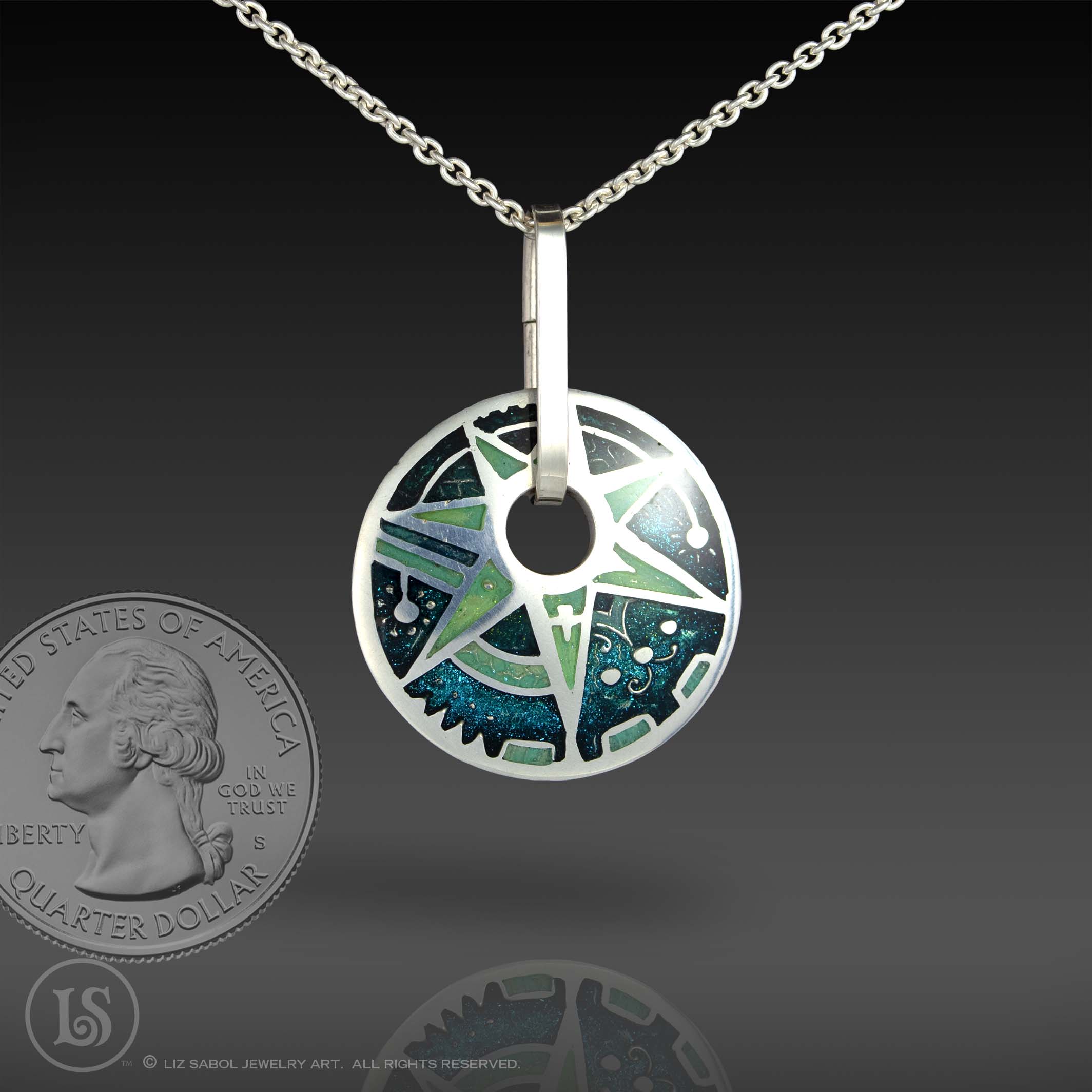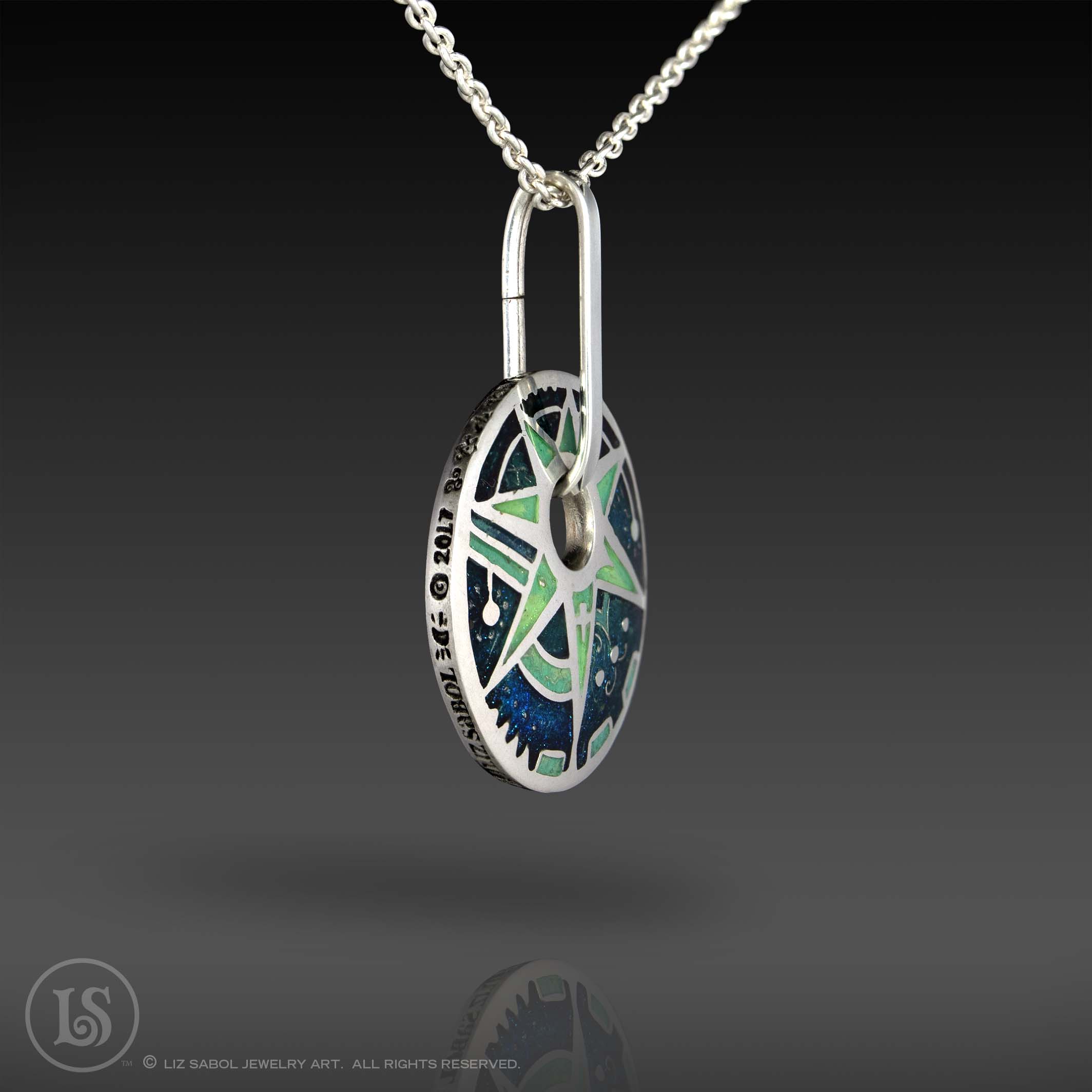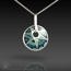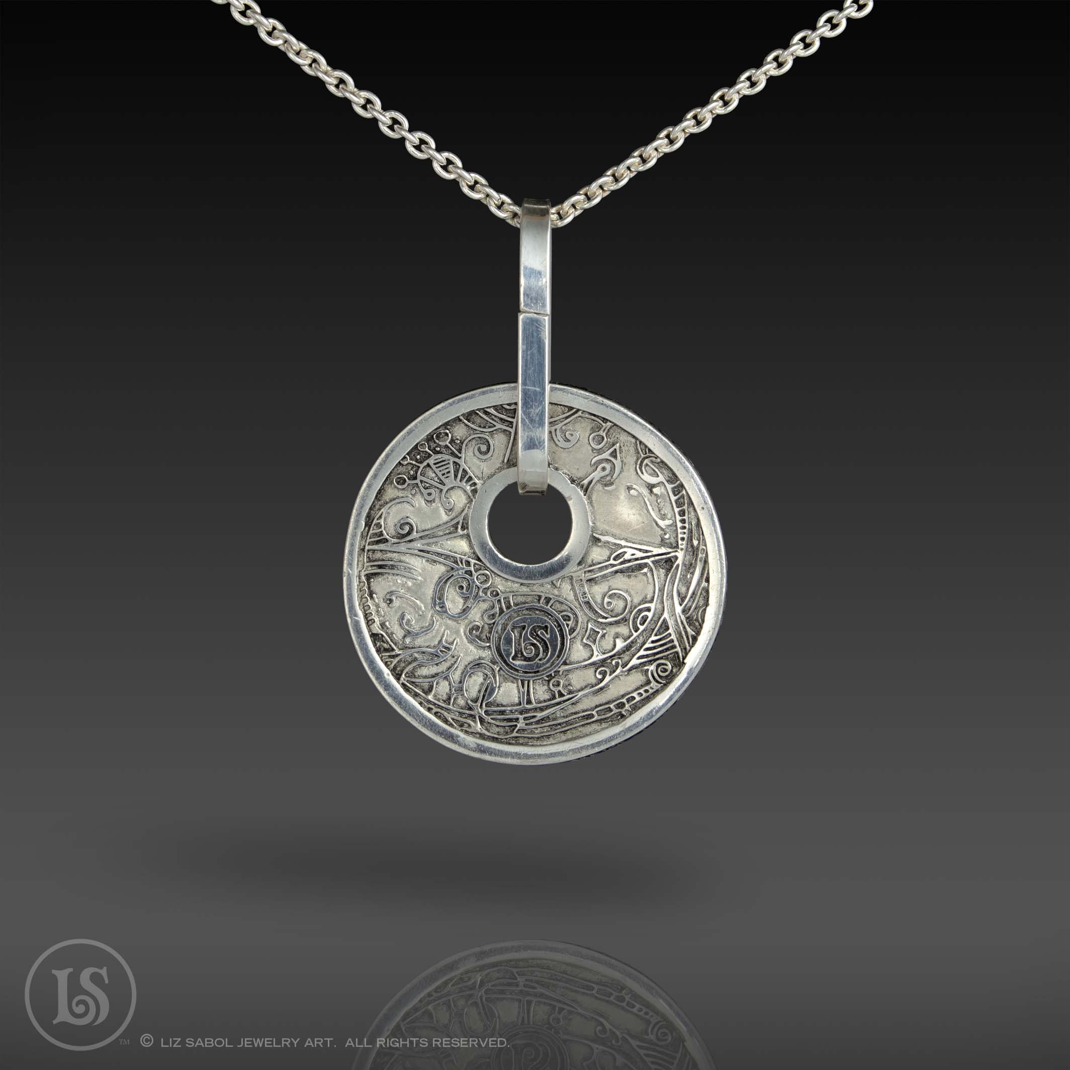 This pendant is hand-crafted in 960 sterling silver metal clay, hand-painted and filled with resin.  The resin is sanded flush and re-polished. The edge is decorated with runes.