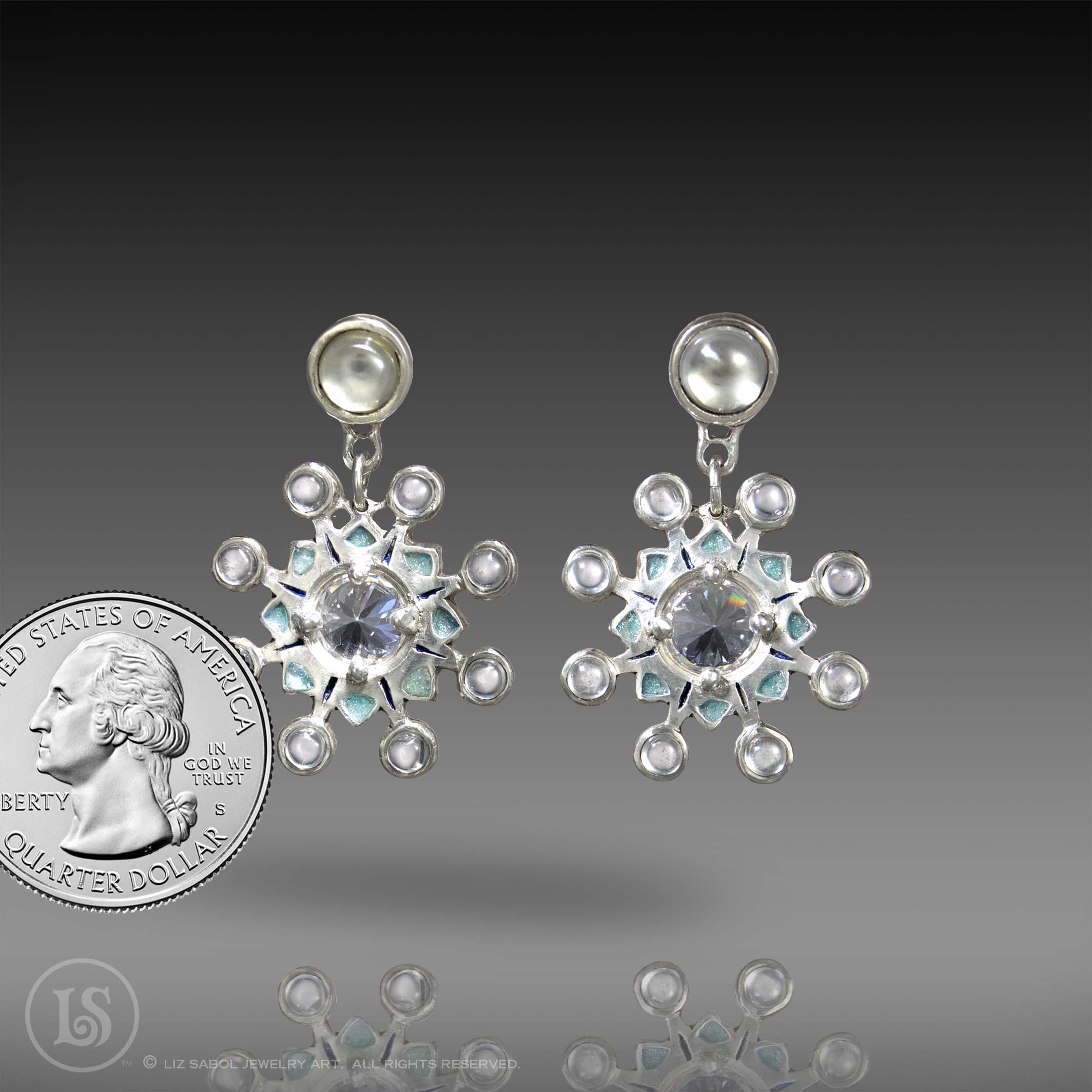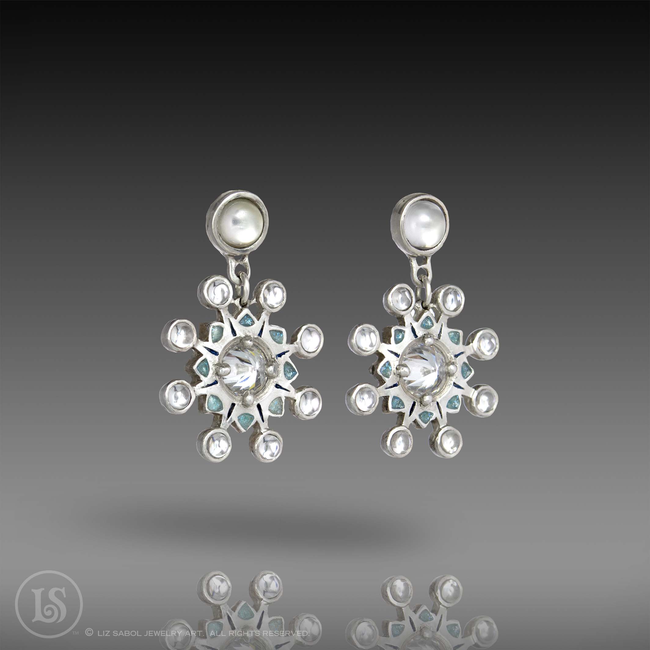 These earrings are hand-crafted in 960 sterling silver metal clay, with cubic zirconia gems. They are hand-painted and filled with resin.