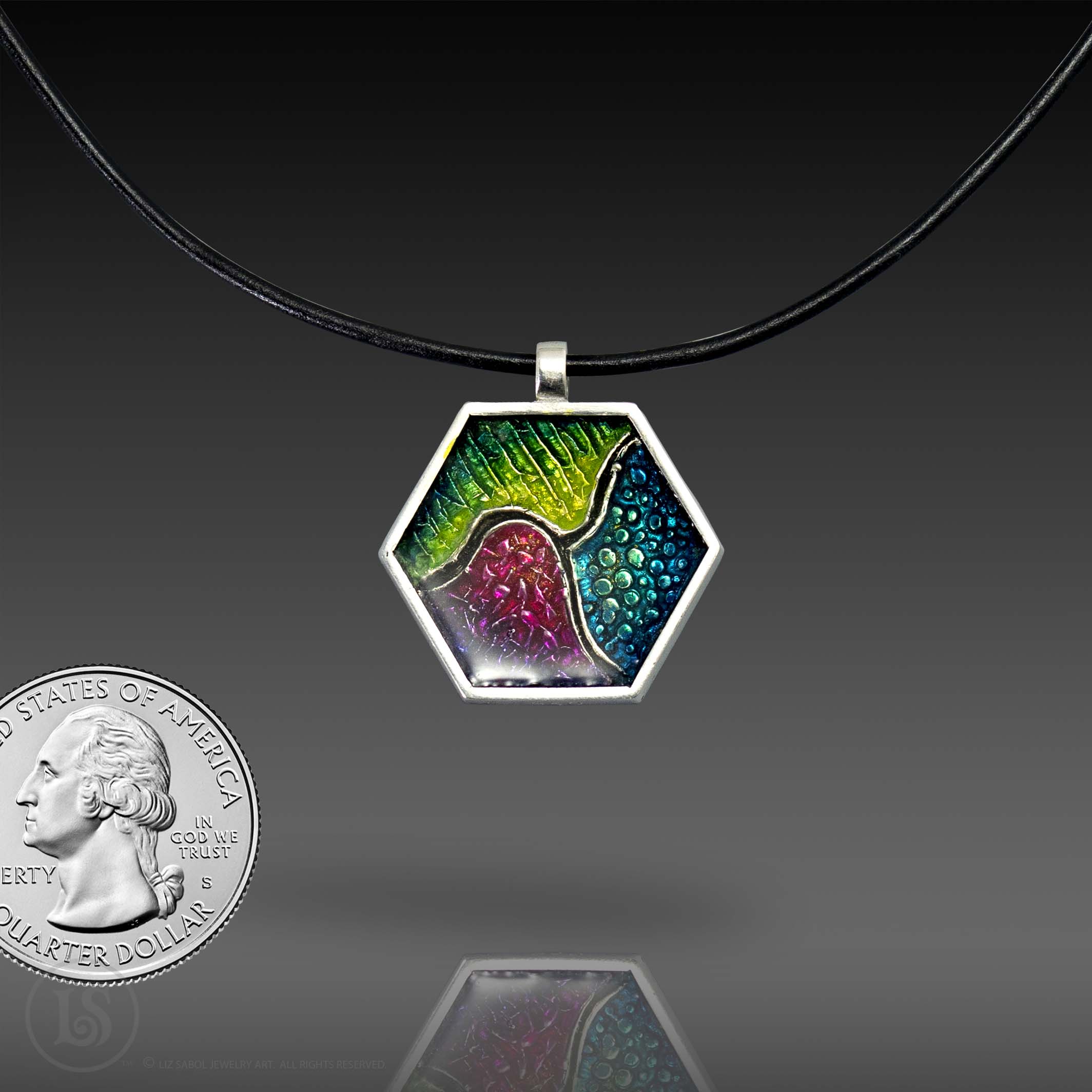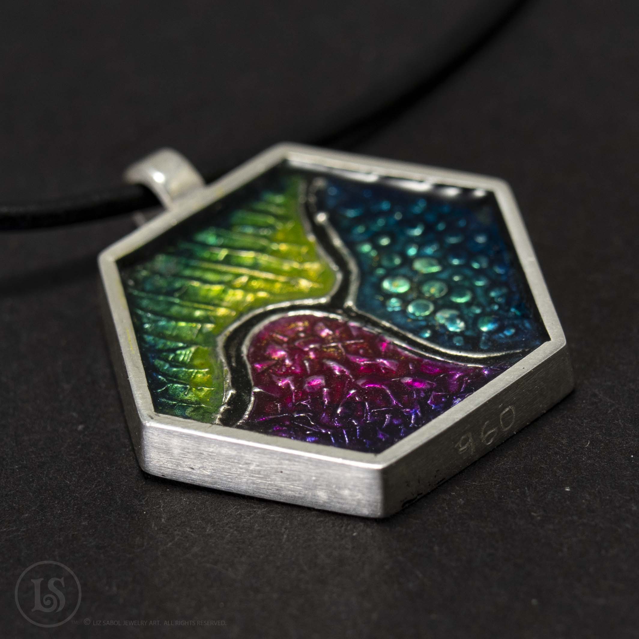 Hand-painted 960 sterling silver. Hand-made, one-of-a-kind. Cold-enamel. Ink, resin. Bail fits delicate cords and chains. Cord/chain not included.