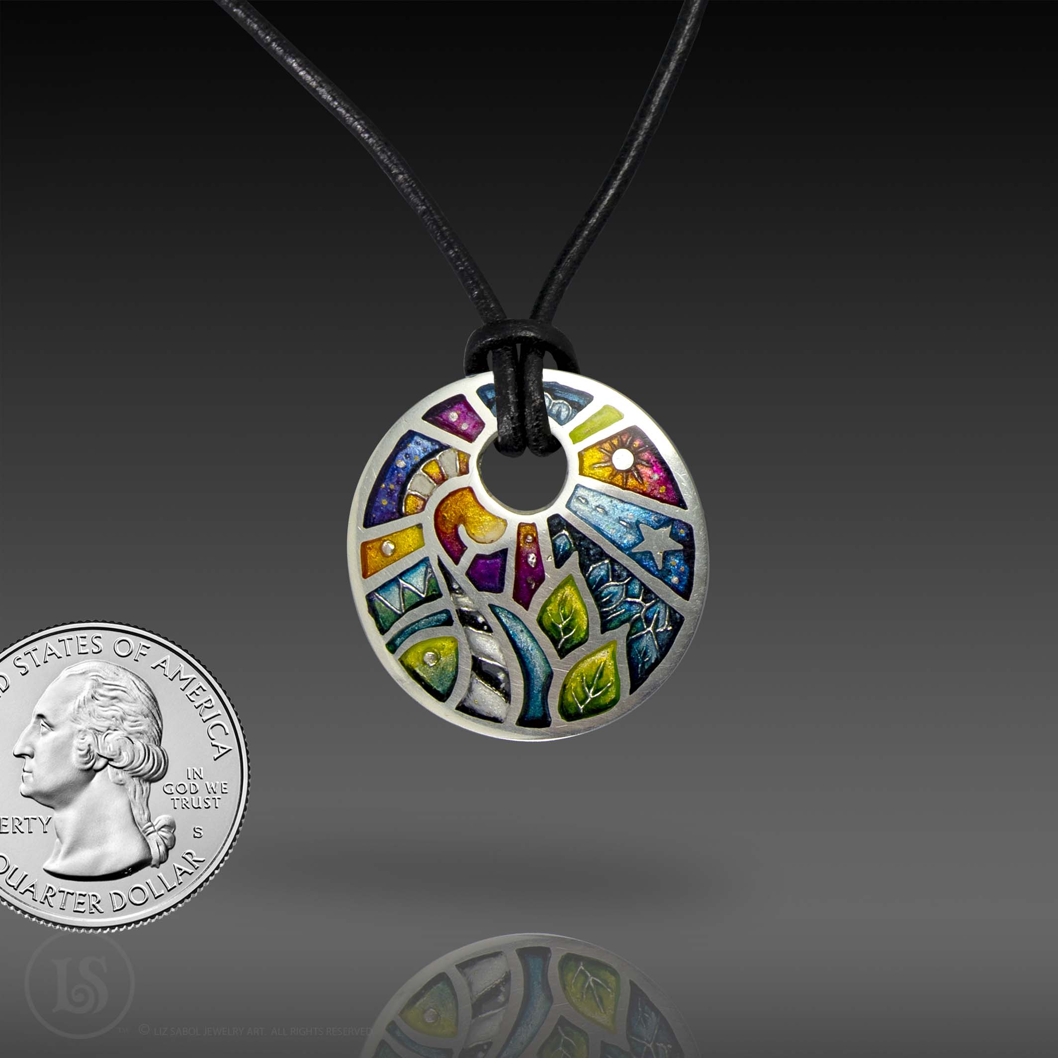 Hand-made, one of a kind. Hand-painted 960 sterling silver. Cold-enamel. Ink, resin. Comes on an 18" leather cord.
