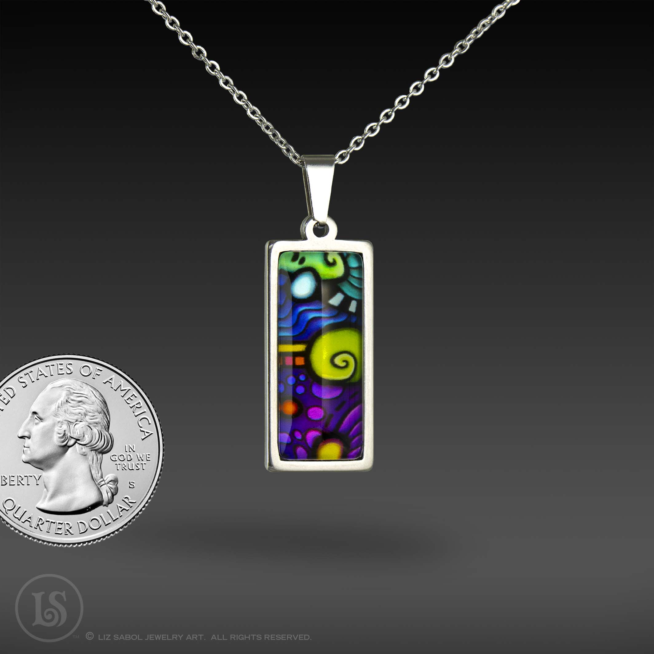 This is a high-quality reproduction in Giclee, archival fine-art print, with vivid color and a mother-of-pearl shimmer, of my colorful abstract illustration #3, mounted on stainless steel and covered in solid glass. Affordable for everyone. Available in silver-tone. Comes with a stainless steel chain.