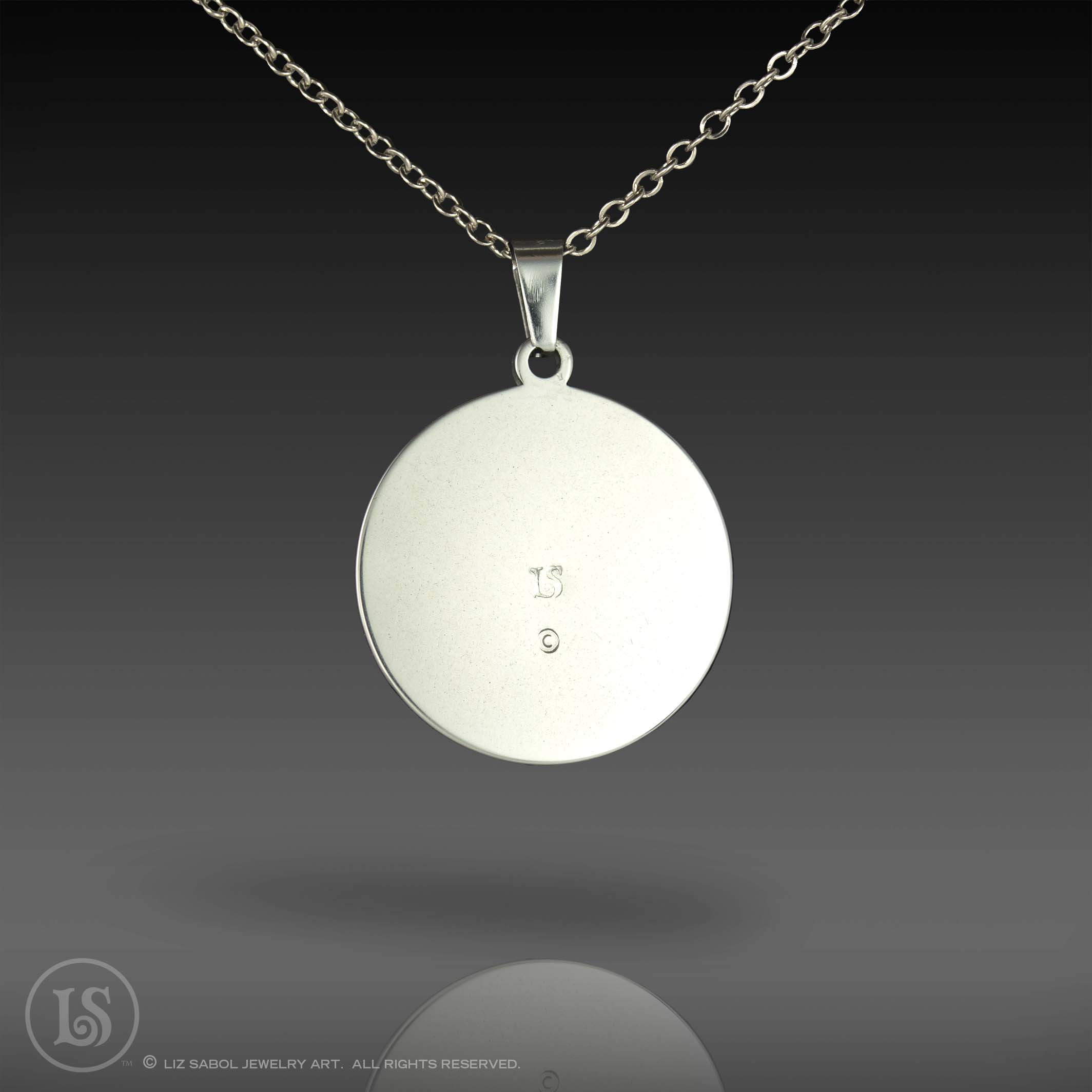 This is a high-quality reproduction in ink and foil of my popular handmade champleve Celestial Sun design, mounted on stainless steel and covered in solid glass. Affordable for everyone. Comes with a stainless steel chain.